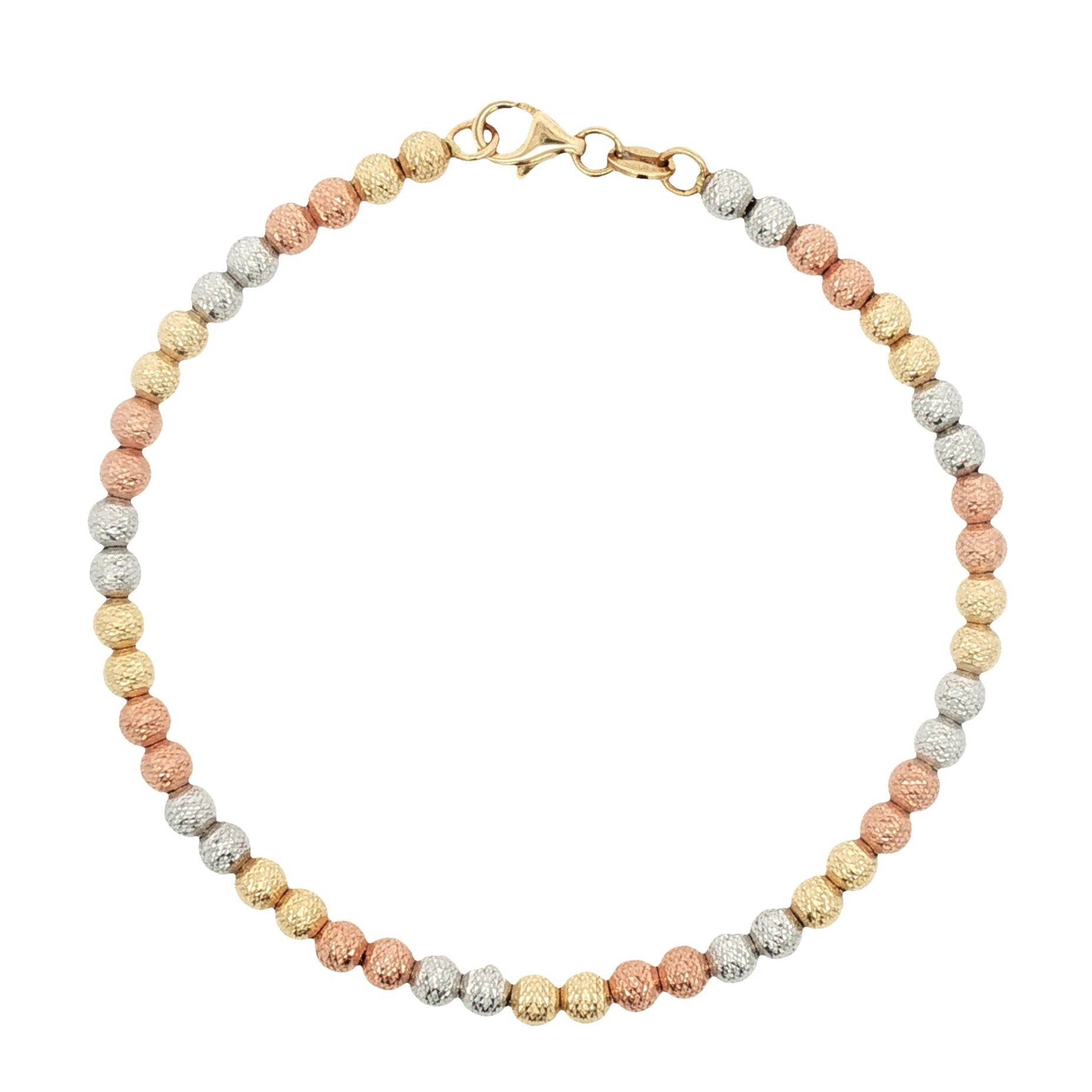Add a touch of elegance to your wrist with our Balls Bracelet. Crafted in 18k tri-color golds, this bracelet weighs 5.30g and measures 7.5 inches. The tri-color golds give it a unique and eye-catching look, perfect for both casual and formal occasions. Its delicate yet sturdy design makes it a timeless piece that can be passed on for generations. Elevate your style with this exquisite Balls Bracelet.