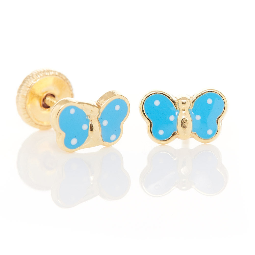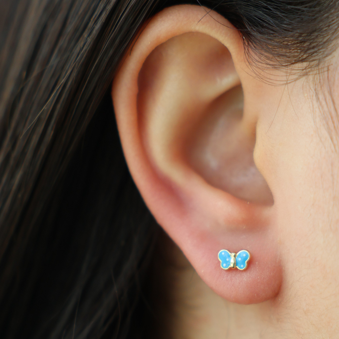 Add a touch of whimsy to your outfit with our Blue Butterfly Stud earrings. Crafted from 18k yellow gold, these delicate studs weigh only 0.40g, making them lightweight and comfortable to wear. The vibrant blue enamel adds a pop of color and the butterfly design exudes a sense of grace and elegance. Perfect for everyday wear or special occasions, these studs are a must-have for any jewelry collection.