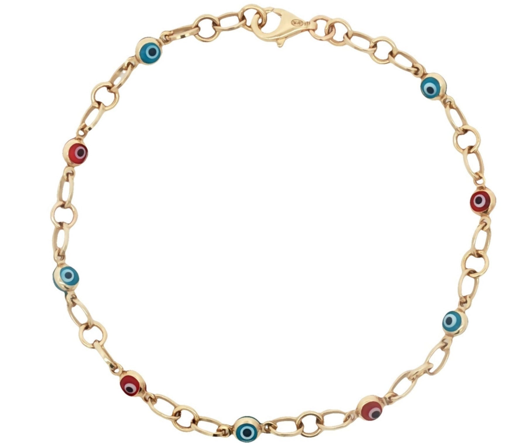 Adorn your wrist with the elegance of our Blue and Red Turk Eye Bracelet. Crafted in stunning 18k yellow gold, this bracelet weighs 4.00g and measures 7.5 inches in length. The vibrant and symbolic Turk Eye design is believed to protect against negative energy and bring good fortune. With its delicate yet durable construction, this bracelet is perfect for everyday wear or special occasions. Add a touch of charm and meaning to your jewelry collection with the Turk Eye Bracelet.