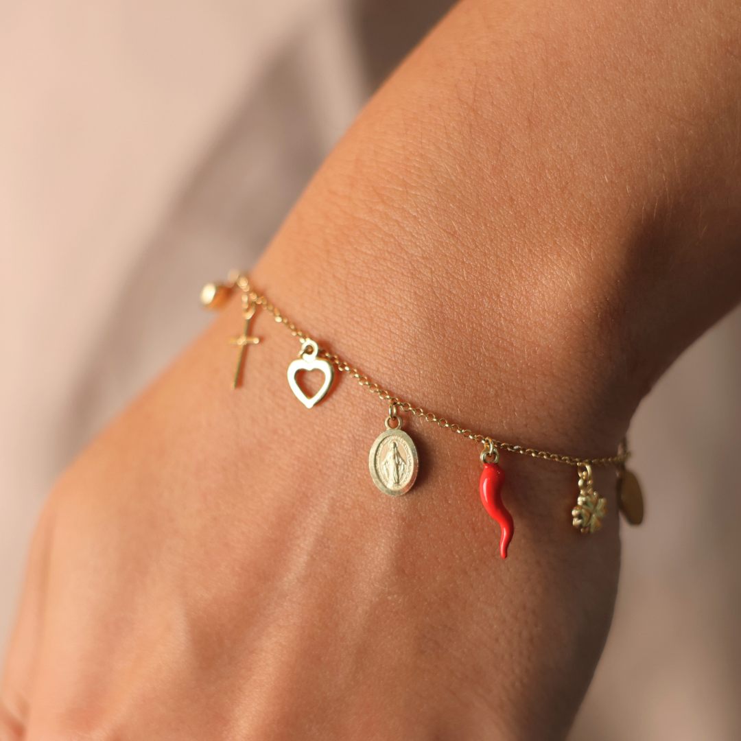 Crafted with precision, the Cuernos y Charms Bracelet showcases the perfect blend of elegance and style. Made from 18k yellow gold, this 5.20g bracelet exudes timeless beauty. The intricate design features stunning charms and horn-shaped accents, adding a touch of uniqueness to your ensemble. Elevate your jewelry collection with this exquisite piece that effortlessly complements any outfit. Ideal for both casual and formal occasions, this bracelet is a must-have for those who appreciate fine craftsmanship and exquisite design.