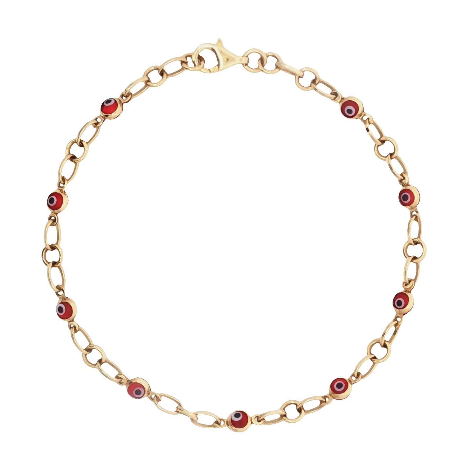Adorn your wrist with the elegance of our Red Turk Eye Bracelet. Crafted in stunning 18k yellow gold, this bracelet weighs 4.00g and measures 7.5 inches in length. The vibrant and symbolic Turk Eye design is believed to protect against negative energy and bring good fortune. With its delicate yet durable construction, this bracelet is perfect for everyday wear or special occasions. Add a touch of charm and meaning to your jewelry collection with the Turk Eye Bracelet.