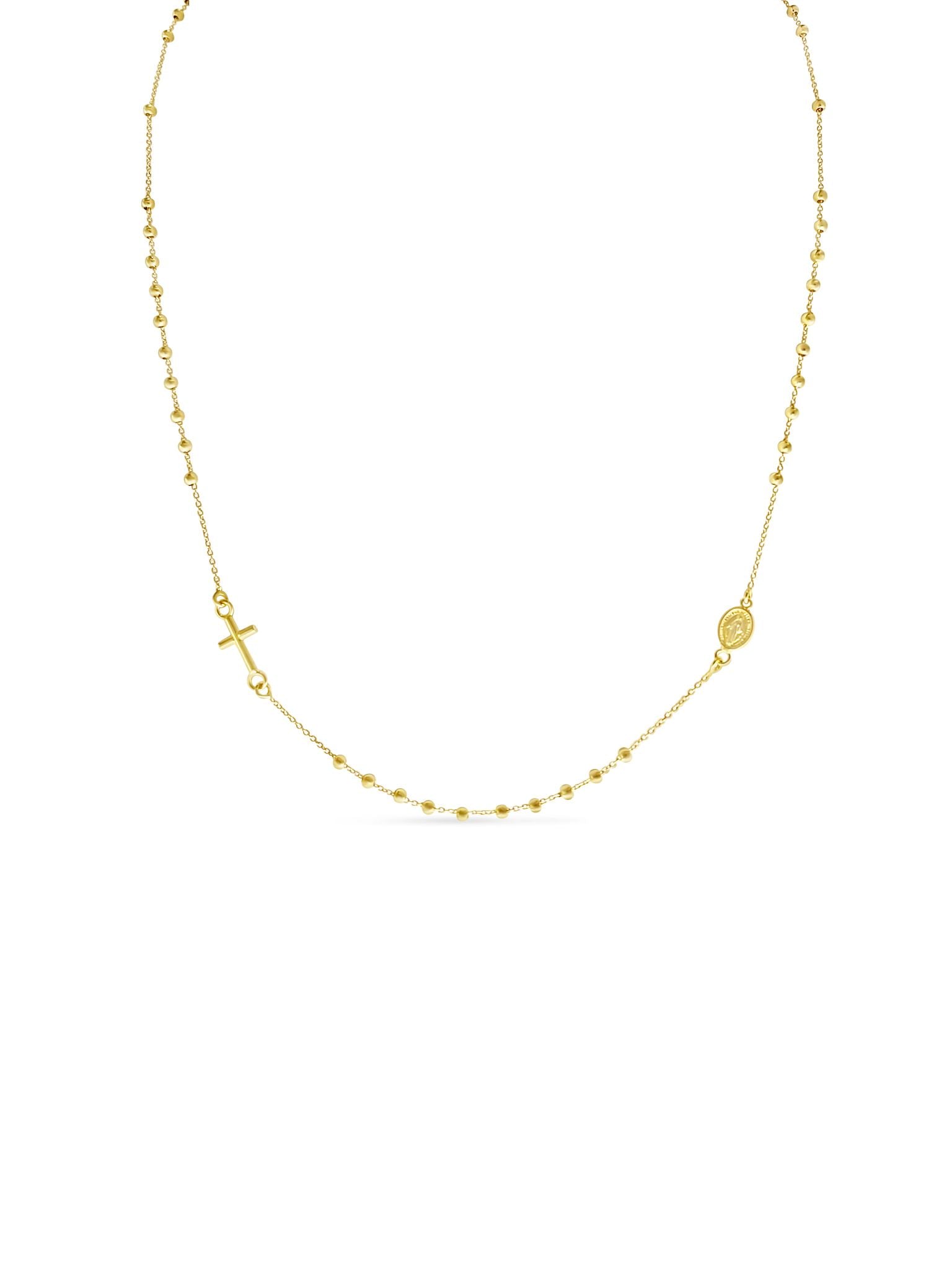 Introducing our Rosary Choker Style necklace in stunning Yellow Gold. Crafted with the highest quality 18k gold, this piece is both elegant and versatile. With a weight of 2.20g, it is lightweight and comfortable to wear. Measuring 16 inches in length, it is the perfect size to adorn your neck. This Rosary Choker Style necklace is a must-have accessory for any occasion, offering a unique and stylish addition to your jewelry collection.