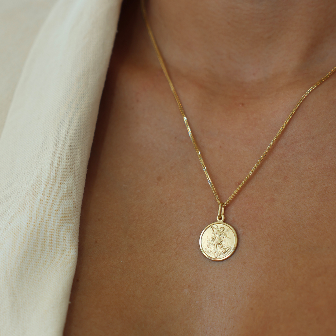 Introducing the San Miguel Arcangel pendant in stunning yellow gold. Crafted with 18k gold, this exquisite pendant weighs 3.10g and measures 17mm. A symbol of protection and guidance, this pendant beautifully captures the grace and strength of the archangel. With its intricate details and expert craftsmanship, this pendant is a true testament to the artistry of fine jewelry. Elevate your style and embrace the spiritual significance with the San Miguel Arcangel pendant.