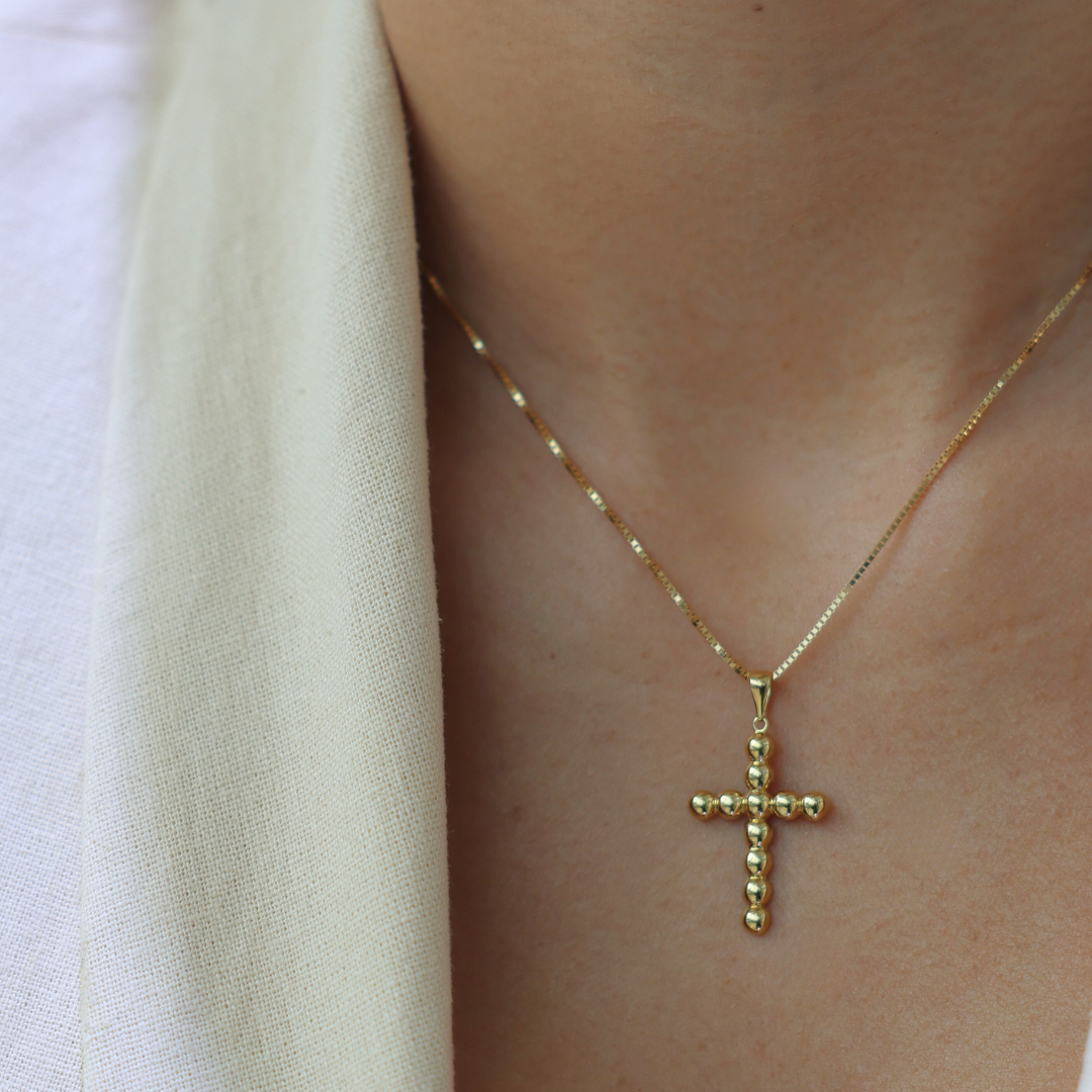 Introducing our Cross Fancy Style in Yellow Gold. This stunning piece is crafted with 18k gold, weighing 1.70g. The Half Balls Cross pendant measures 31mm, making it a stylish and versatile accessory. Perfect for adding a touch of elegance to any outfit. With its exquisite design and fine craftsmanship, this is a must-have for any jewelry collection.