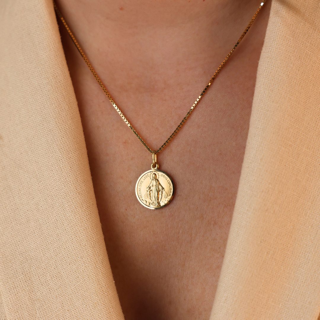 Add a touch of devotion to your ensemble with the Virgen Milagrosa pendant. Crafted from 18k yellow gold, this stunning piece weighs 3.20g and measures 17mm in size. The intricate details of the Virgin Mary are beautifully displayed, making it a symbol of faith and protection. Wear it close to your heart and let its elegance and significance shine through.